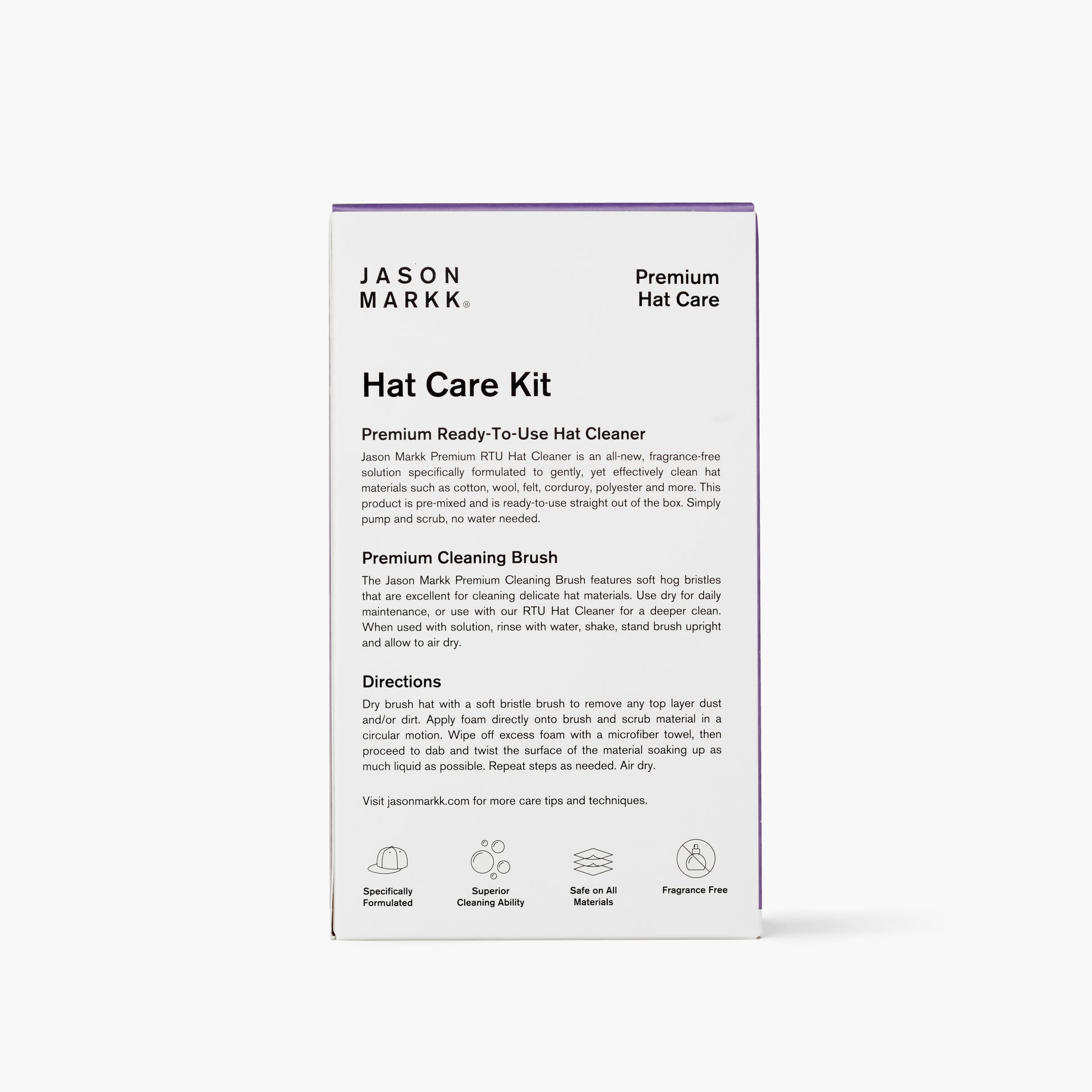 The key to keeping your hats looking fresh is by routinely maintaining them. Our Hat Care Kit makes it easy to do just that! Premium Ready-To-Use Hat CleanerJason Markk Ready-To-Use Hat Cleaner is a fragrance-free solution specifically formulated to gently, yet effectively clean hat materials such as cotton, wool, felt, corduroy, polyester and more. This product is conveniently pre-mixed and ready-to-use straight out of the bottle. Simply pump and scrub, no water needed.Premium Cleaning Brush (AKA Delicates Cleaning Brush)The Jason Markk Premium Cleaning Brush features soft hog bristles that are excellent for cleaning delicate hat materials. Use dry for daily maintenance, or use with our RTU Hat Cleaner for a deeper clean. When used with solution, rinse with water, shake, stand brush upright and allow to air dry.The bottle and applicator are fully recyclable. The box packaging is constructed from partially recycled material.
